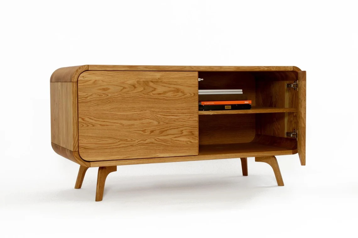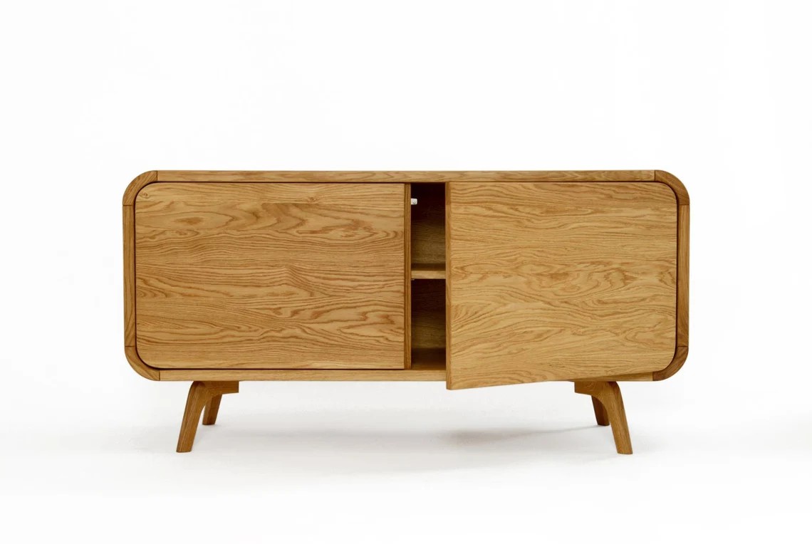 Komoda Aura Form wyposażona jest w dwie szafki z drzwiczkami wyposażonymi w system otwierania push-to-open. Całość konstrukcji jest bardzo solidna i stabilna, głównie dzięki wykorzystaniu litego drewna dębowego.