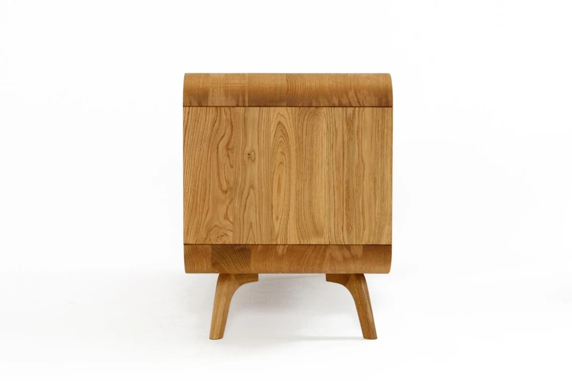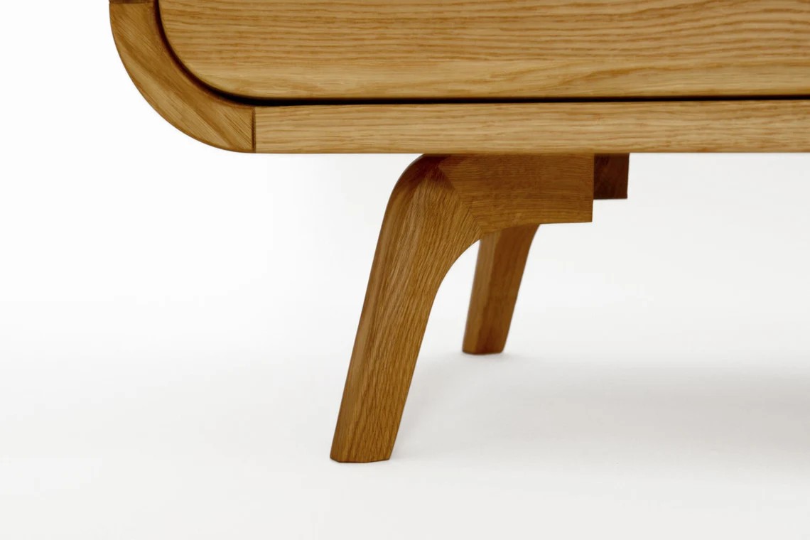 Komoda Ferra Form to mebel wykonany z najwyższą starannością z naturalnego, litego drewna dębu europejskiego. Żywy materiał zamknięty został w pięknej i stylowej formie nawiązującej do wspaniałego styli mid century, który został dodatkowo złagodzony subtelnymi zaokrągleniami. Dzięki nim prosta i minimalistyczna forma mebla zyskuje lekkość i idealnie wpasuje się nawet w najbardziej wymagające wnętrze. Brak widocznych uchwytów dodatkowo wygładza projekt i podkreśla naturalny rysunek dębowego drewna w pełnej okazałości